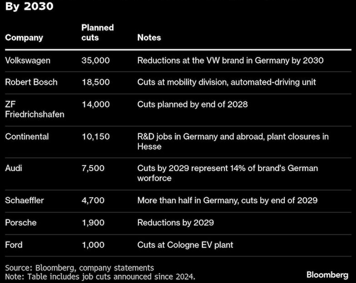 Niemiecki przemysł motoryzacyjny planuje likwidację prawie 100 000 miejsc pracy do 2030 roku (dane: Bloomberg)