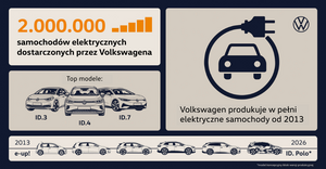 Volkswagen rozpoczął swoją drogę w obszarze elektromobilności w 2013 roku wraz z premierą modelu e-up! i od tego czasu systematycznie rozwija swoje w pełni elektryczne portfolio. Dwa miliony dostarczonych samochodów elektrycznych z napędem akumulatorowym (BEV) obejmują nie tylko modele obecnej rodziny ID., lecz także wcześniejsze pojazdy elektryczne, takie jak e-up! i e-Golf. Obecnie Volkswagen zajmuje wiodącą pozycję w segmencie samochodów w pełni elektrycznych w Niemczech i w całej Europie oraz należy do producentów o najwyższych wolumenach sprzedaży. Marka Volkswagen jest również jednym z największych producentów samochodów elektrycznych na świecie.